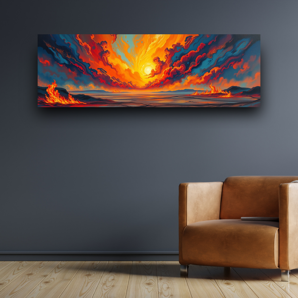 This tempestuous panoramic landscape showcases explosive convergence where earth meets sky in elemental upheaval. Torrents of flame erupt from the horizon while roiling cloud formations surge in amber, vermillion, and azure tones. Ground-level conflagrations create vertical pillars of fire that mirror the sky’s tumultuous energy. The wide-format composition amplifies the sense of infinite chaos, capturing that critical moment when peaceful landscape transforms into primal theater. This commanding presence energizes any space with bold atmospheric drama and untamed magnificence.