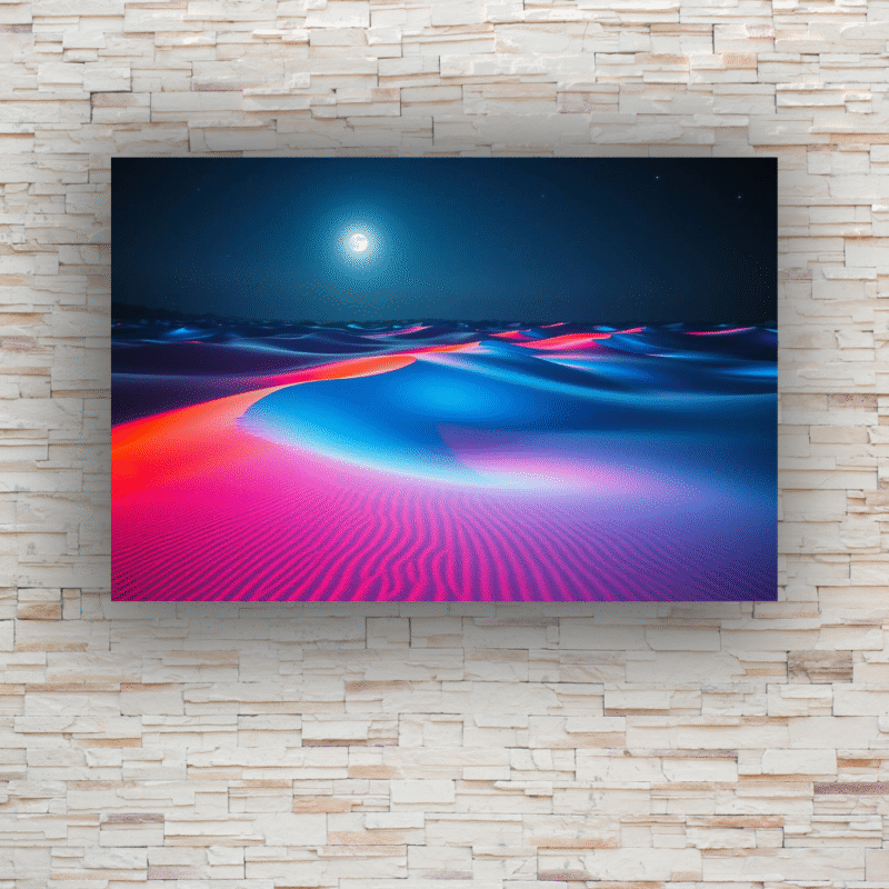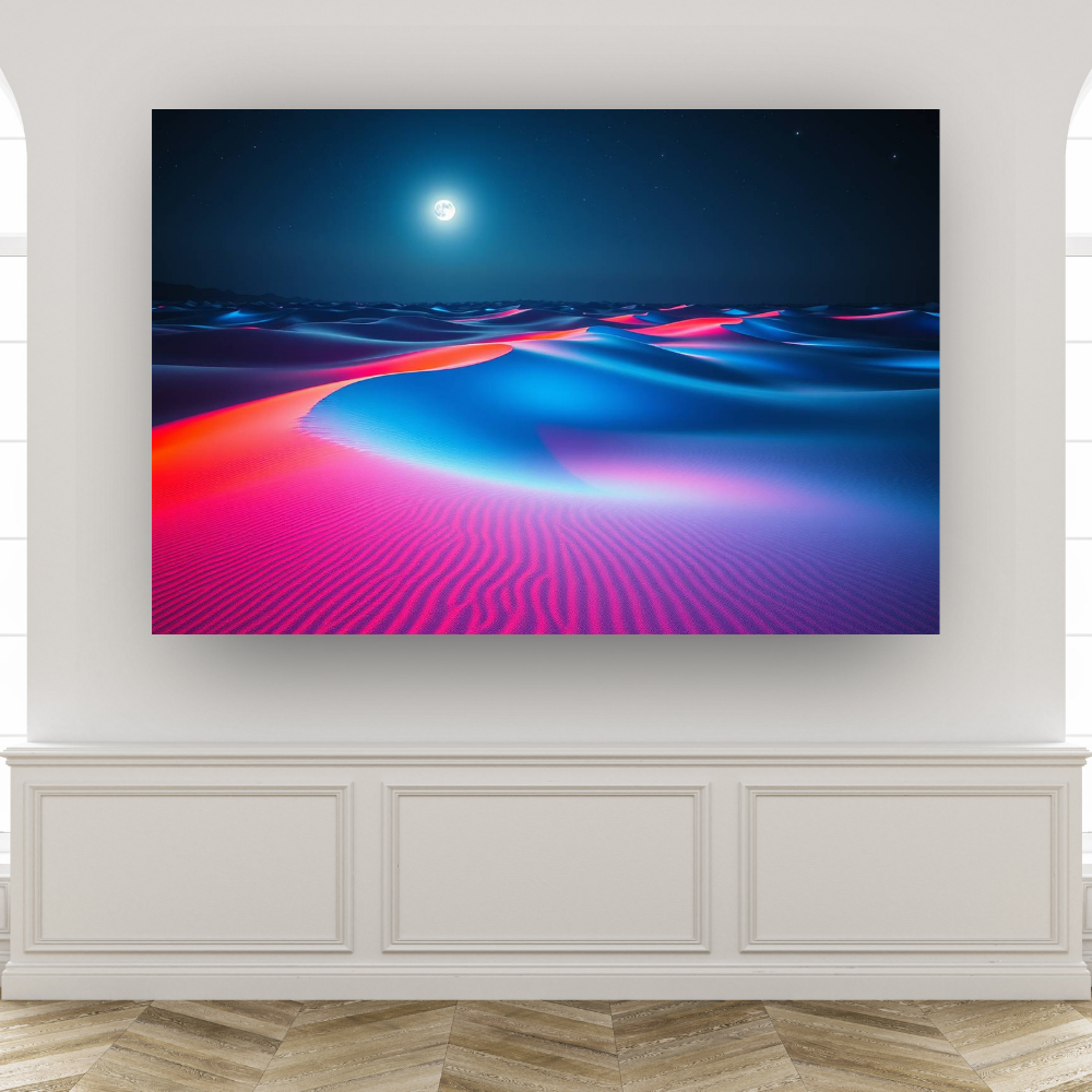 Endless rolling sand dunes glow with electric neon colors of vibrant pink, blue, and purple under a brilliant full moon in this futuristic desert scene. Flowing dune formations create incredible movement while dramatic color transitions add stunning depth. Rippled sand textures and neon highlights complete this otherworldly landscape. The large acrylic format makes every glowing detail and electric color incredibly vivid and surreal. Perfect for bringing futuristic desert magic and neon energy to any space.